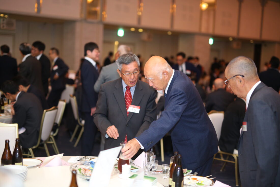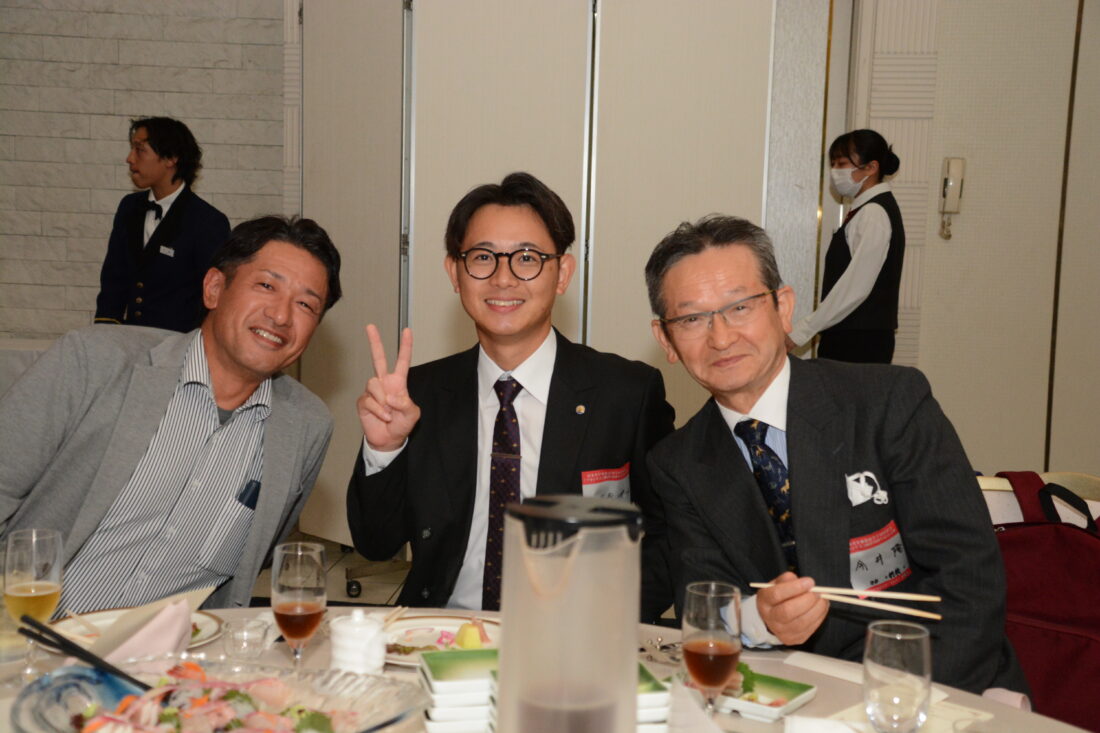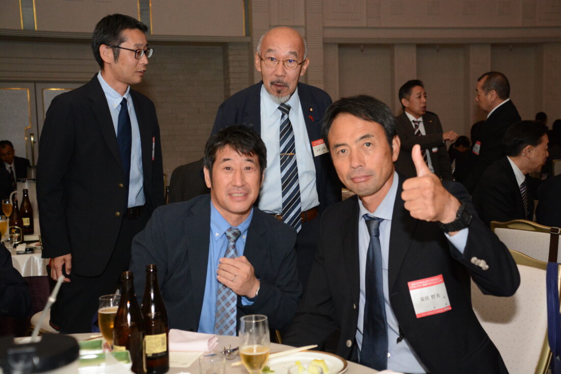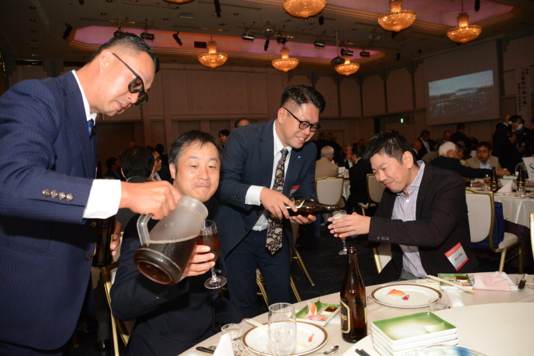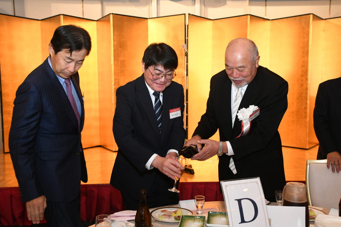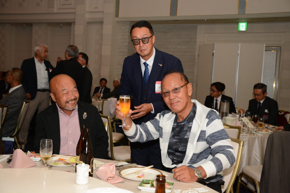 その後、新会長・大場俊之様から前会長・村山様へ感謝と慰労の意を込めた記念品と花束が贈られ、大場様の乾杯の発声で祝賀会が開かれました。