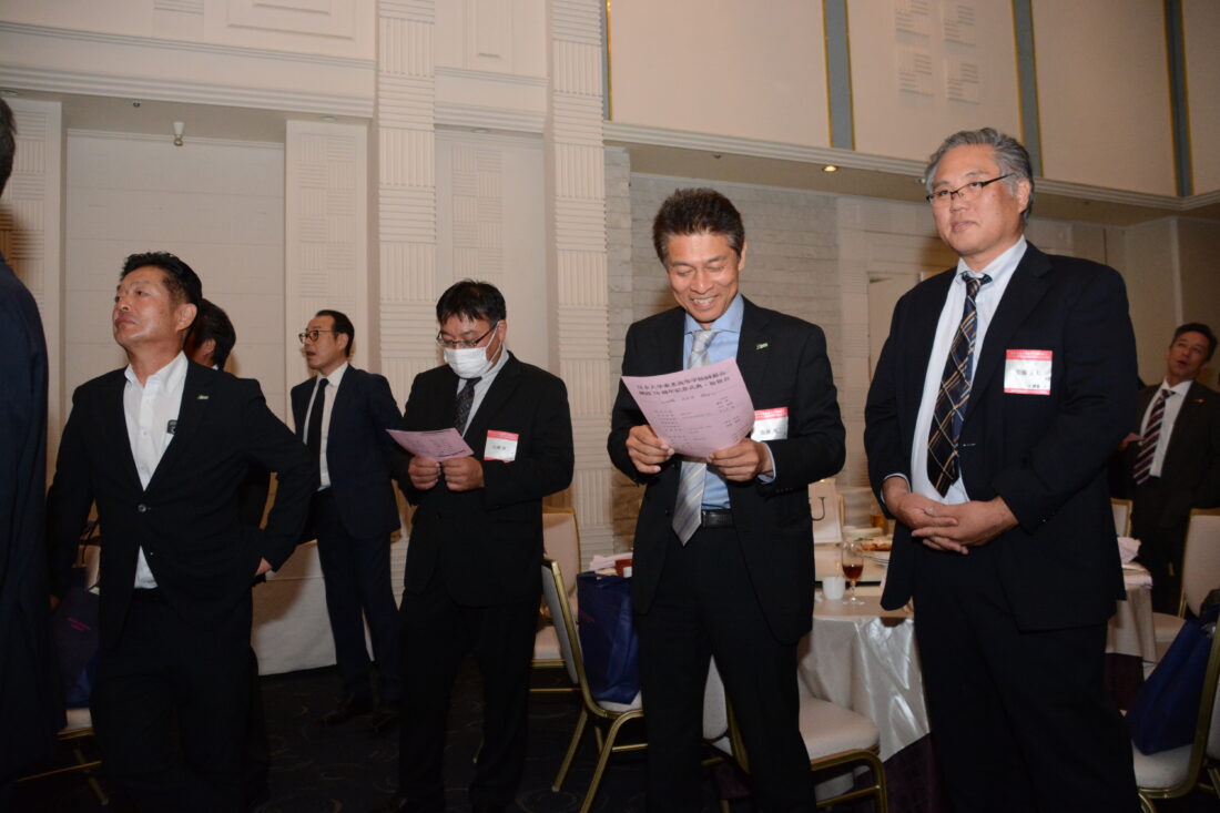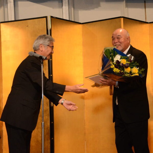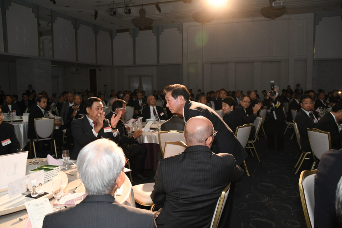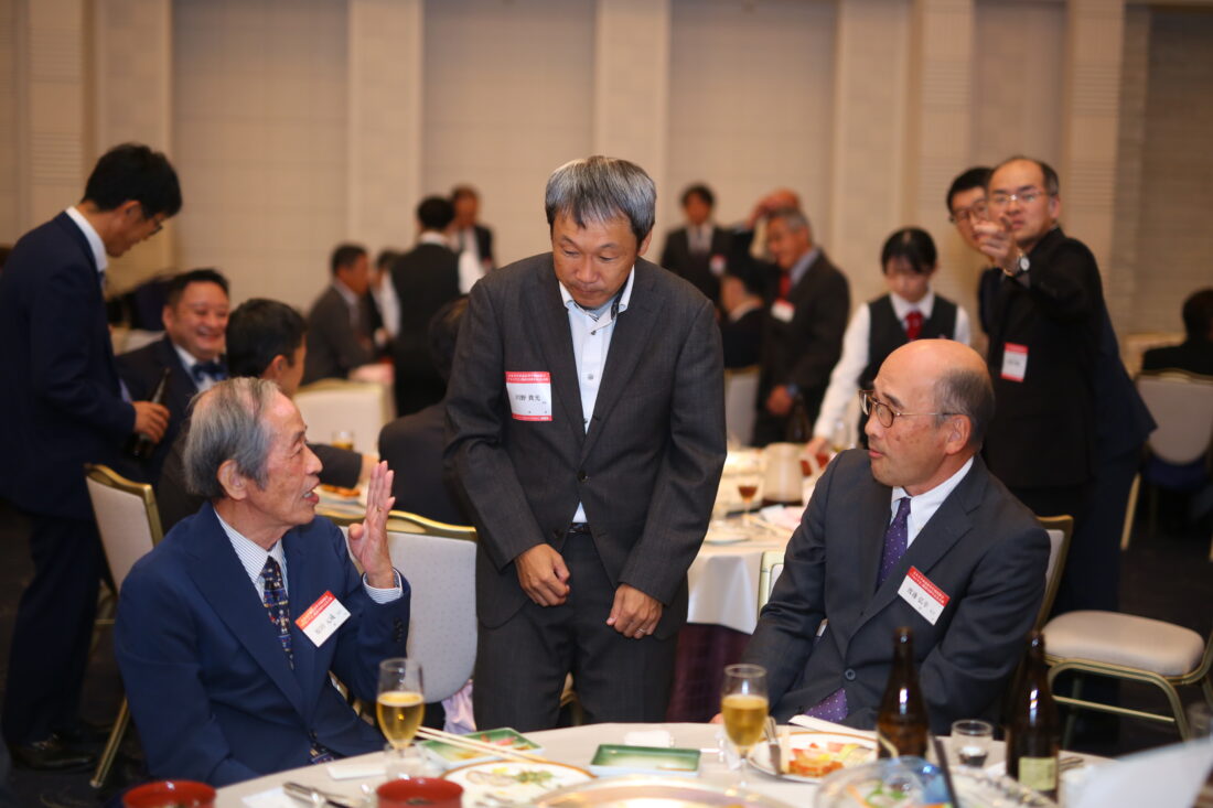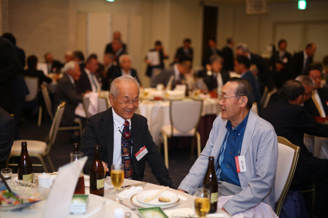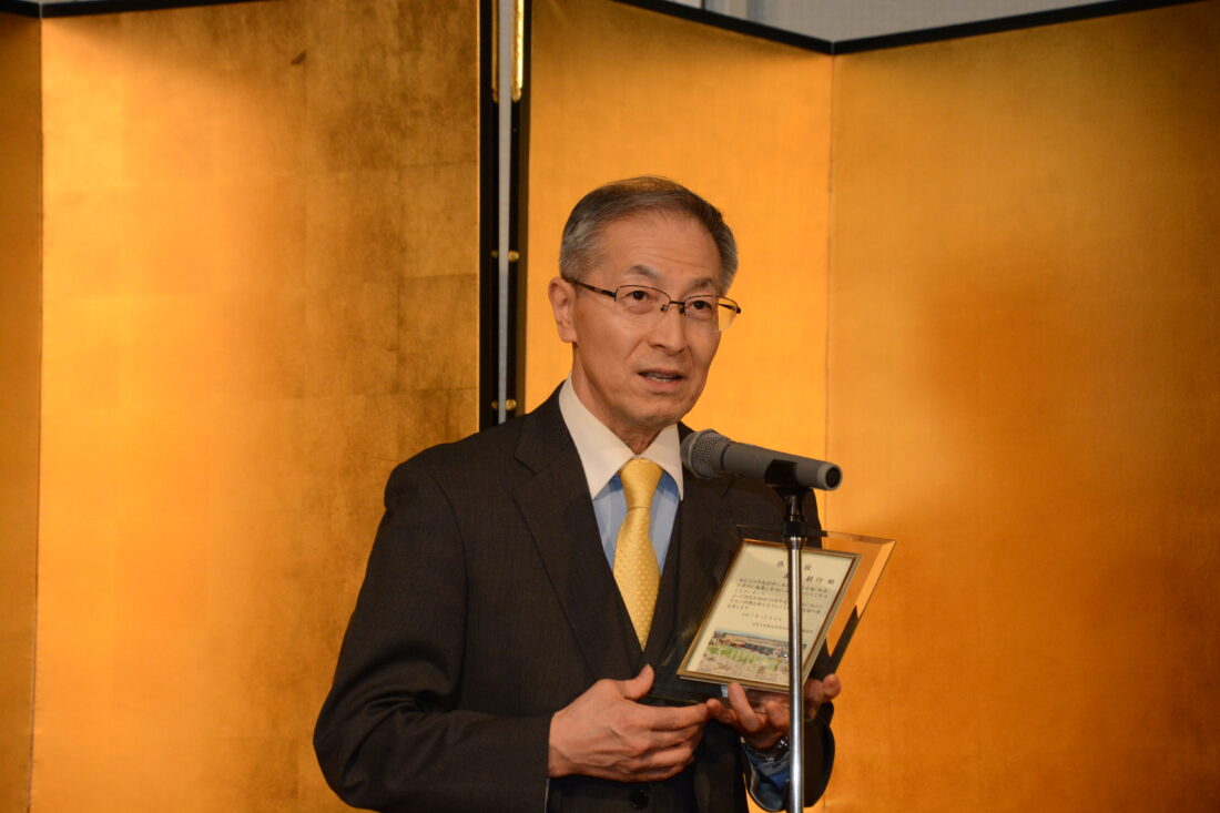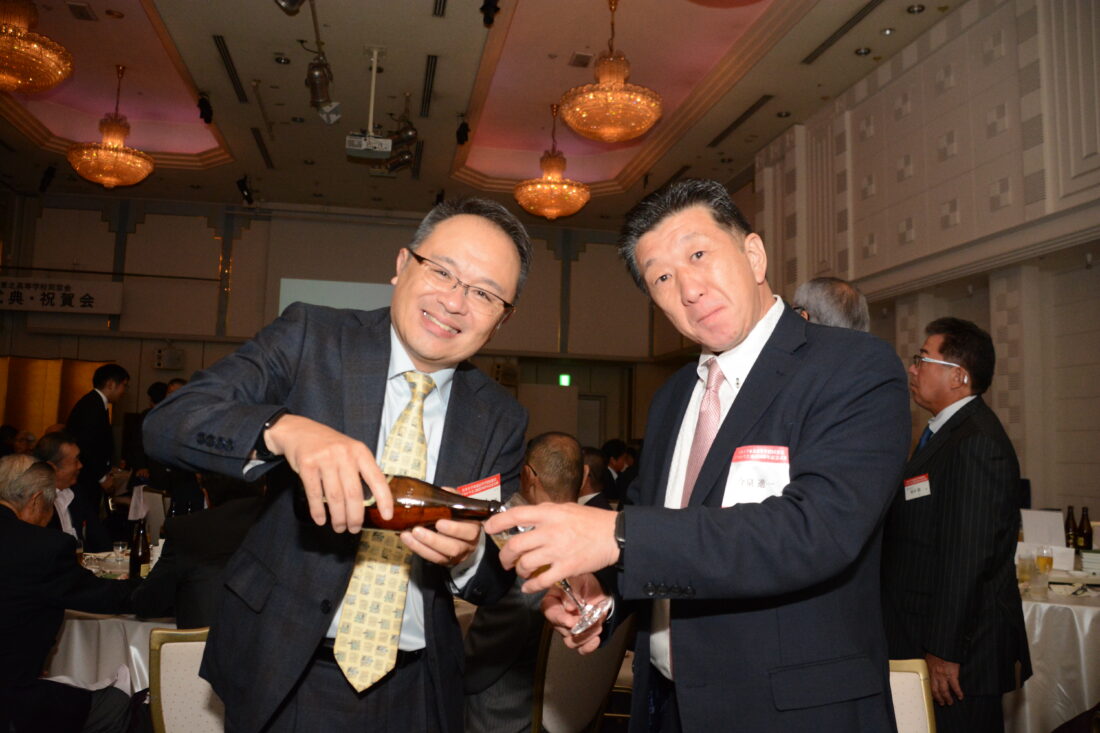 その後、新会長・大場俊之様から前会長・村山様へ感謝と慰労の意を込めた記念品と花束が贈られ、大場様の乾杯の発声で祝賀会が開かれました。