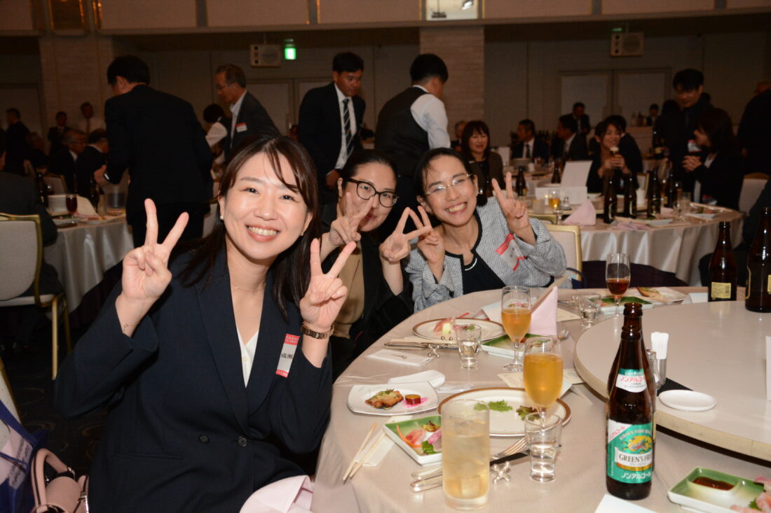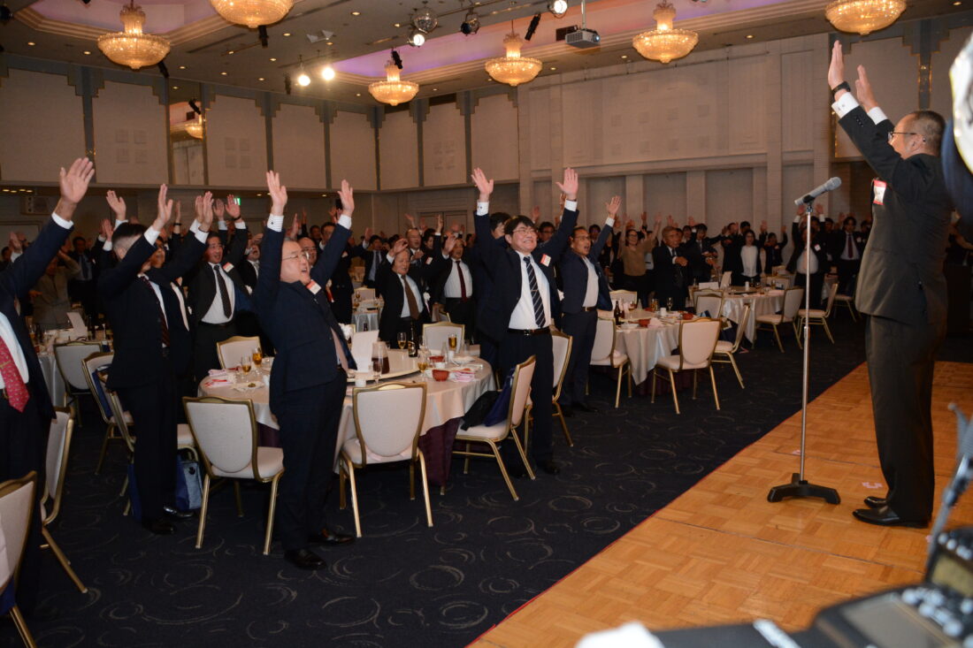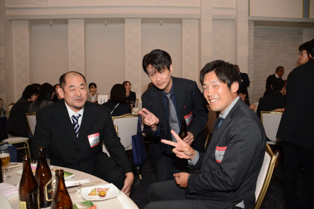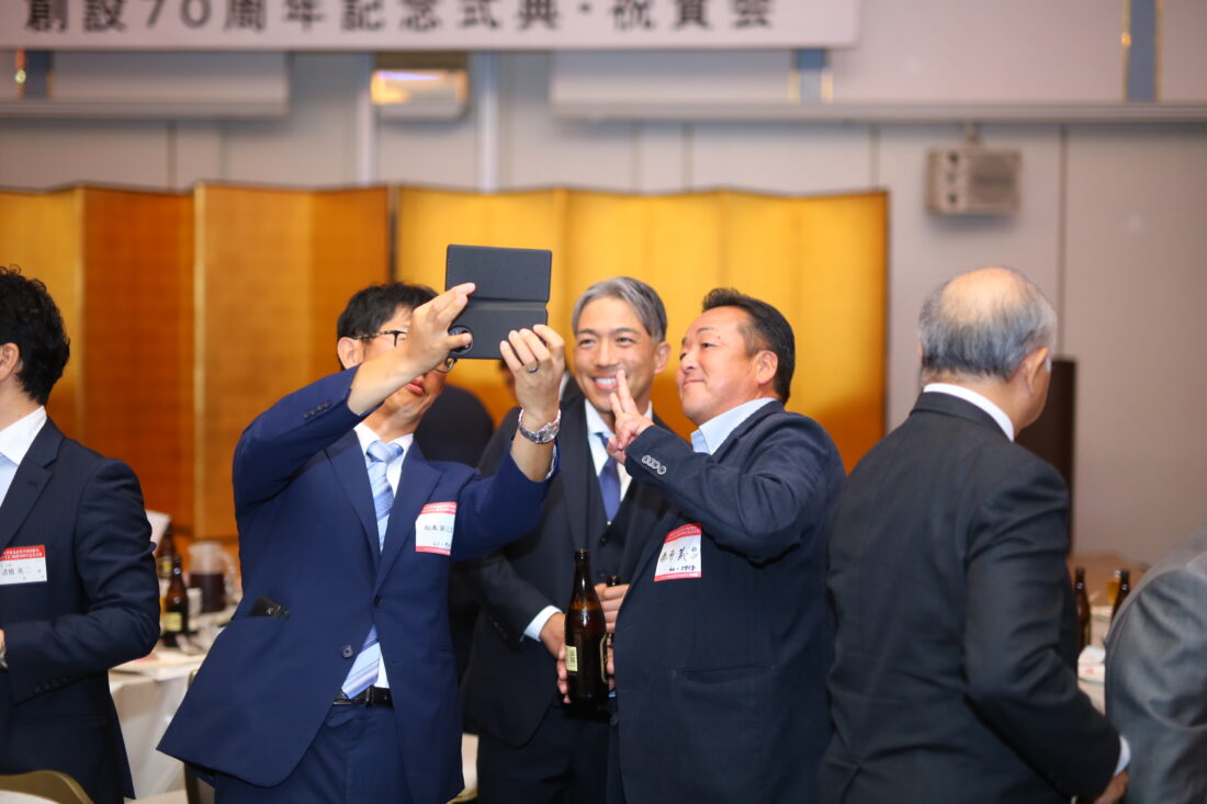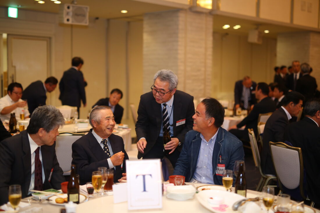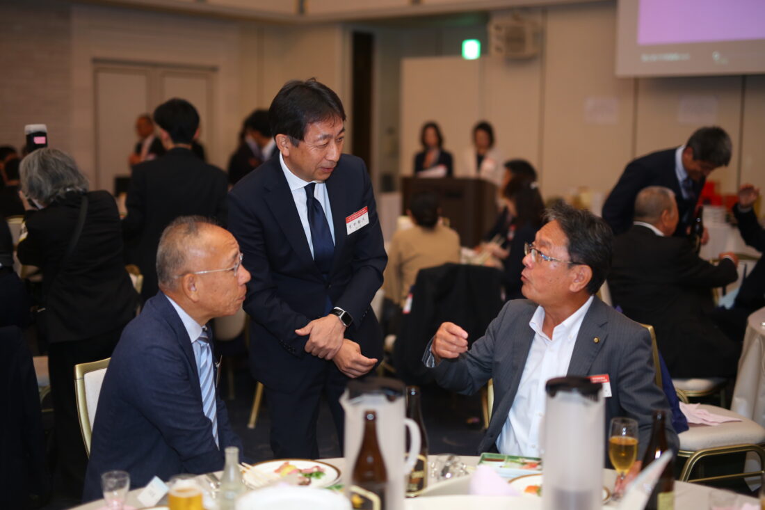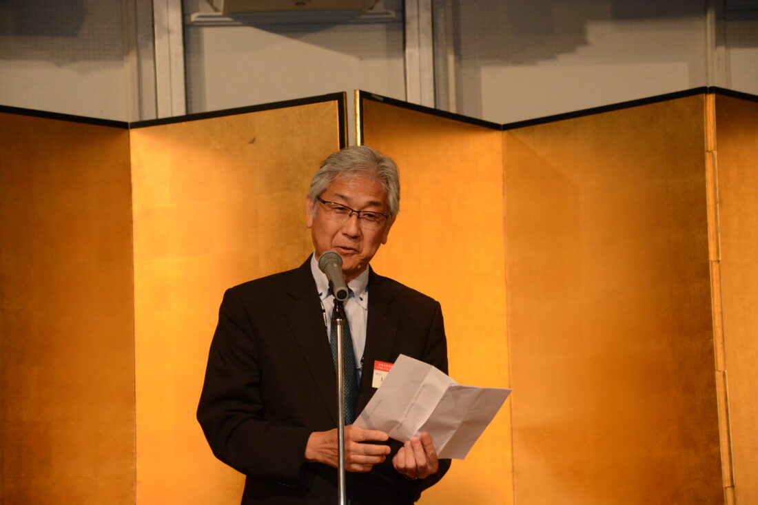 その後、新会長・大場俊之様から前会長・村山様へ感謝と慰労の意を込めた記念品と花束が贈られ、大場様の乾杯の発声で祝賀会が開かれました。