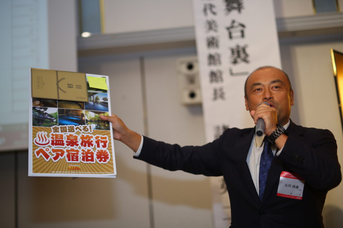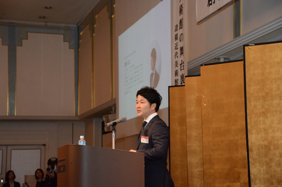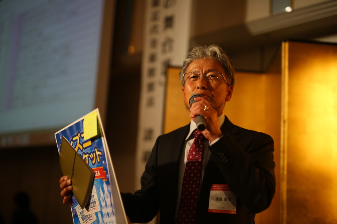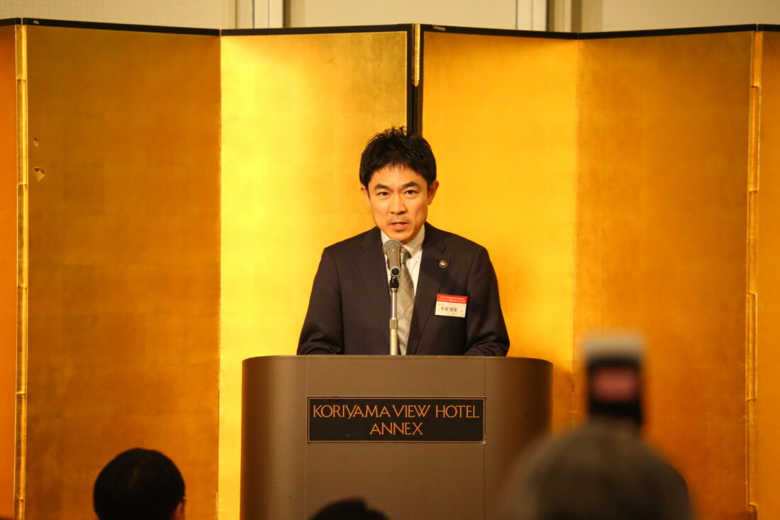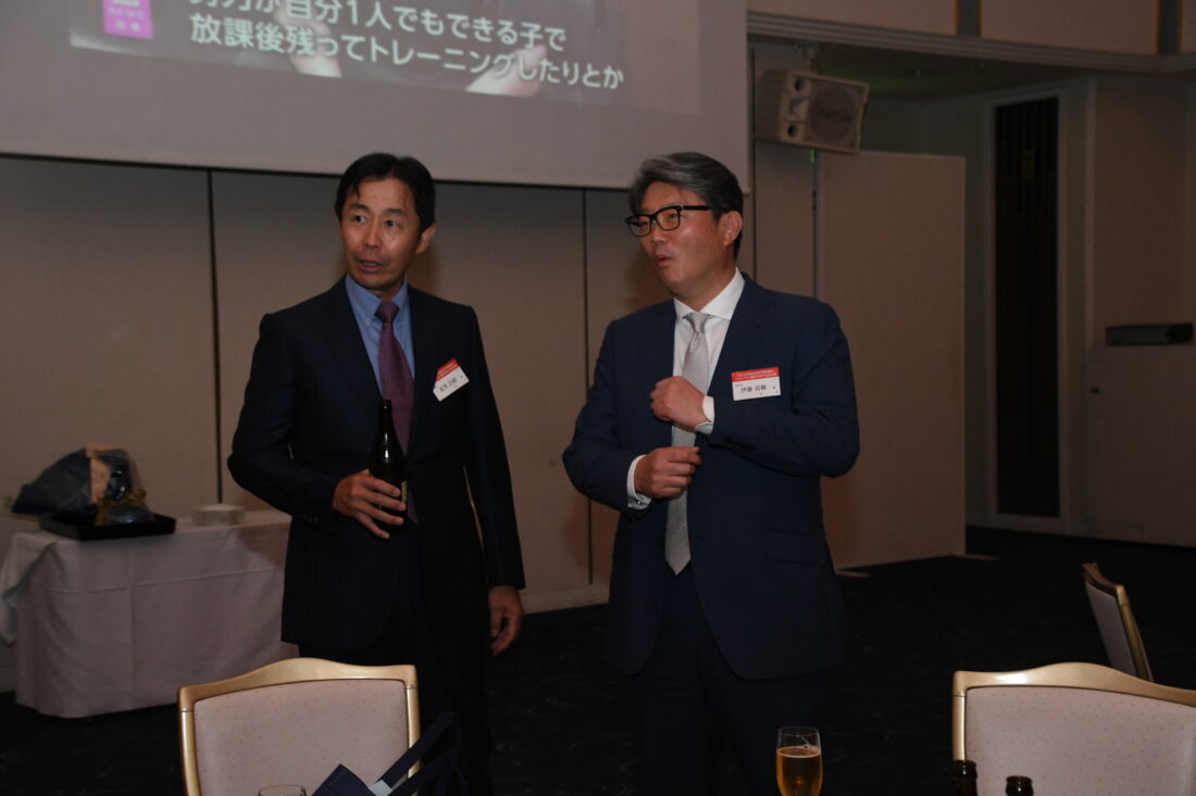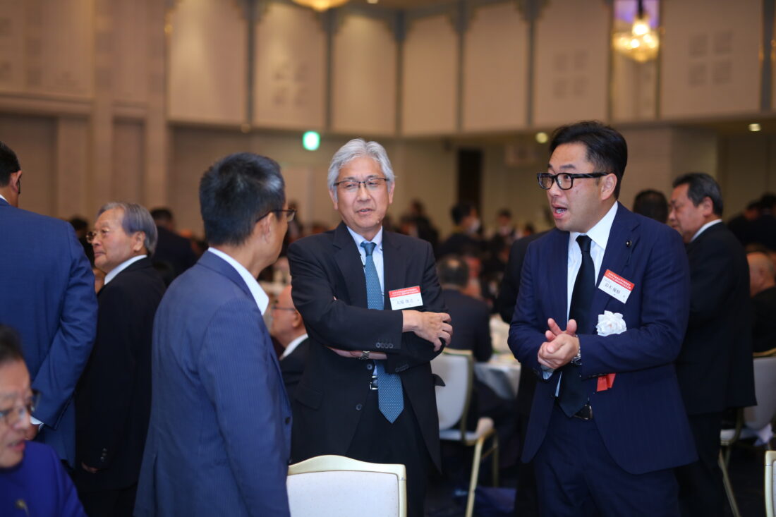 その後、新会長・大場俊之様から前会長・村山様へ感謝と慰労の意を込めた記念品と花束が贈られ、大場様の乾杯の発声で祝賀会が開かれました。