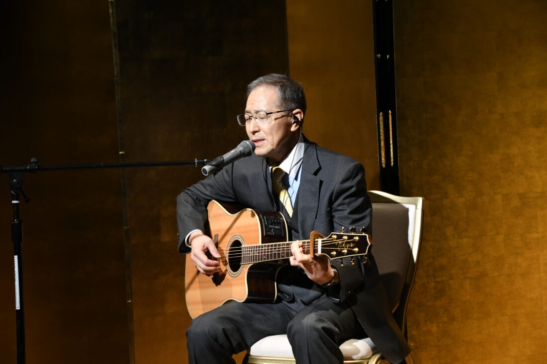 その後、本校教員の髙橋敏行先生による弾き語りが披露されました。この曲は、退職教職員の阿部正栄先生が70周年を祝して書かれた詩に、髙橋先生が曲をつけた特別な作品で、会場は感動に包まれました。